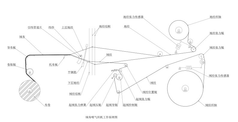 該產(chǎn)品可以織造經(jīng)起絨絨布組織要求的雙層布織物,上下兩層之間有一定高度的絨經(jīng),后經(jīng)過割絨機(jī)將其割開形成兩塊絨布。該產(chǎn)品采用智能化絨布噴氣織機(jī)專用控制系統(tǒng),可以實(shí)現(xiàn)電子送經(jīng)(地經(jīng)、絨經(jīng)分別控制)、電子控制起絨、電子多臂開口、電子控制管道片式噴氣引緯等功能,在織造過程中可以保持張力穩(wěn)定、絨高織造控制精確,采用噴氣式引緯方式不會(huì)與經(jīng)紗邊紗摩擦產(chǎn)生毛板,管道片接力引緯更能夠提高引為效率和降低能耗。